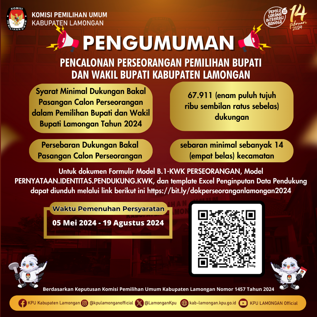 kab-lamongan.kpu.go.id Syarat Minimal dan Persebaran Dukungan Bakal Pasangan Calon Perseorangan dalam Pemilihan Bupati dan Wakil Bupati Lamongan Tahun 2024