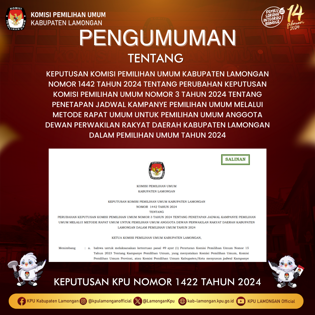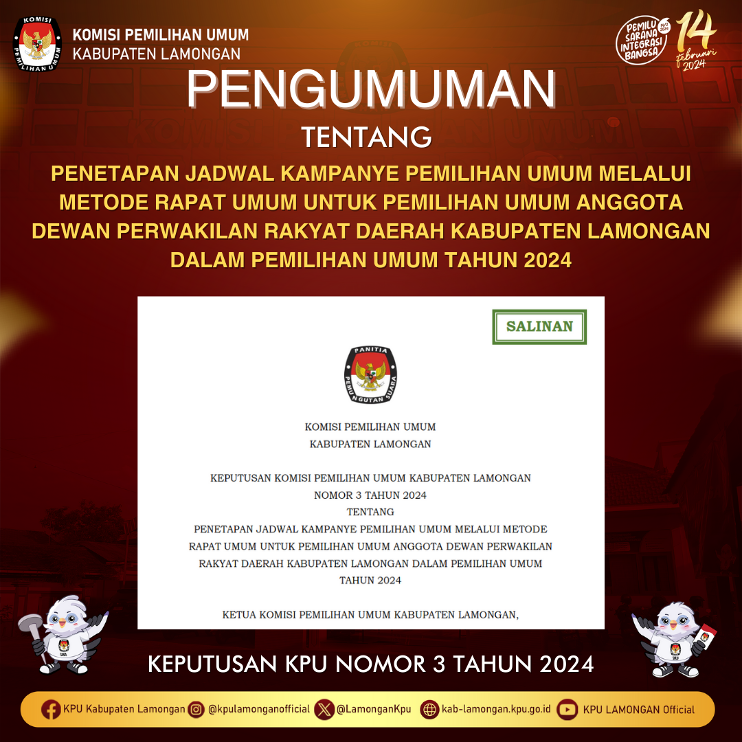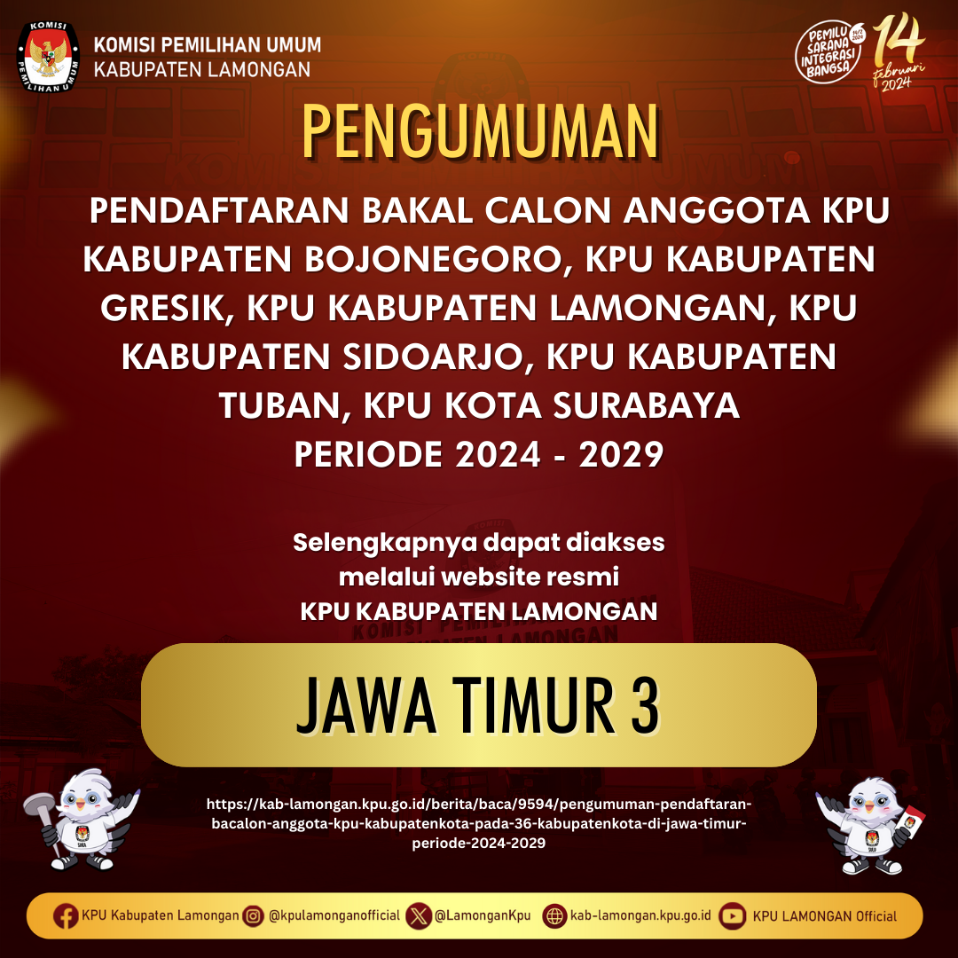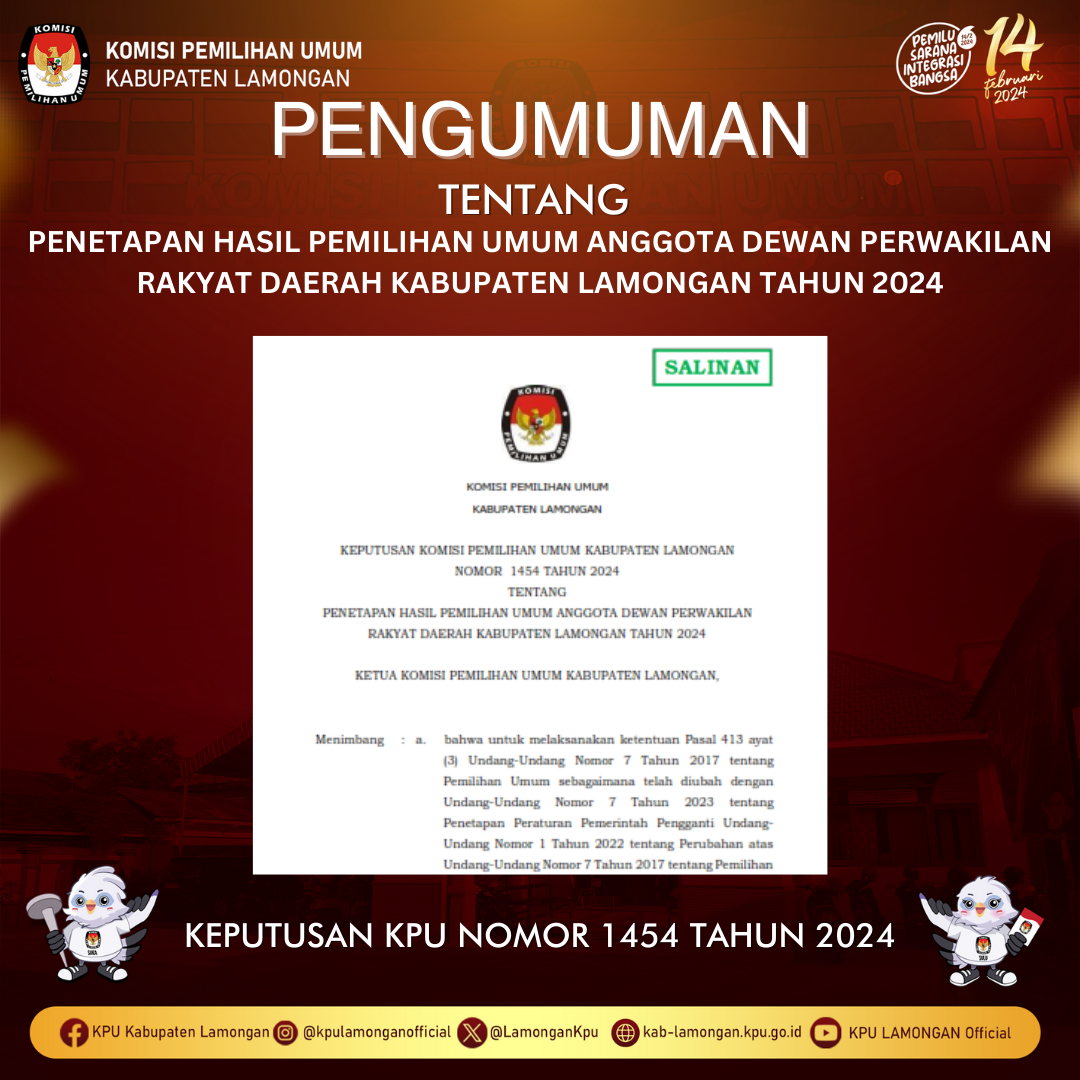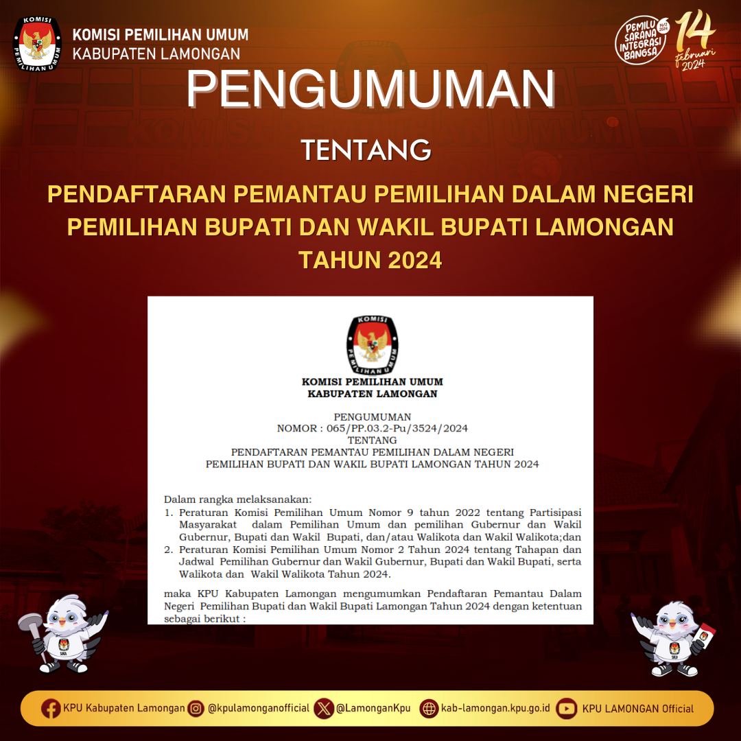 Berikut disampaikan Pengumuman Nomor: 065/PP.03.2-Pu/3524/2024 Tentang Pendaftaran Pemantau Pemilihan Dalam Negeri Pemilihan Bupati dan Wakil Bupati Lamongan Tahun 2024 Unduh Disini