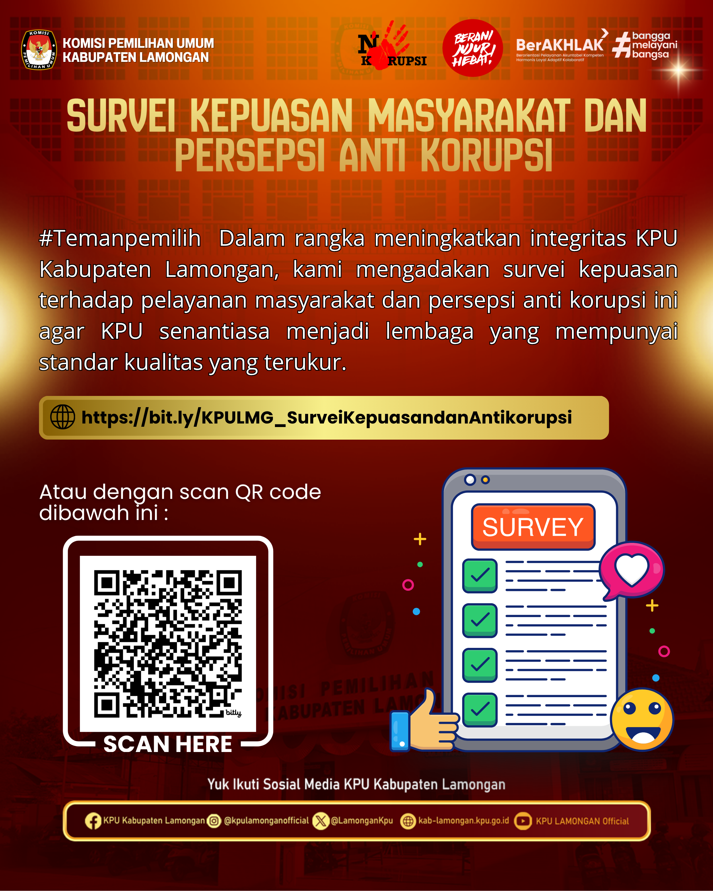 #Temanpemilih Dalam rangka meningkatkan integritas KPU Kabupaten Lamongan, kami mengadakan survei kepuasan terhadap pelayanan masyarakat dan persepsi anti korupsi ini agar KPU senantiasa menjadi lembaga yang mempunyai standar kualitas yang terukur.