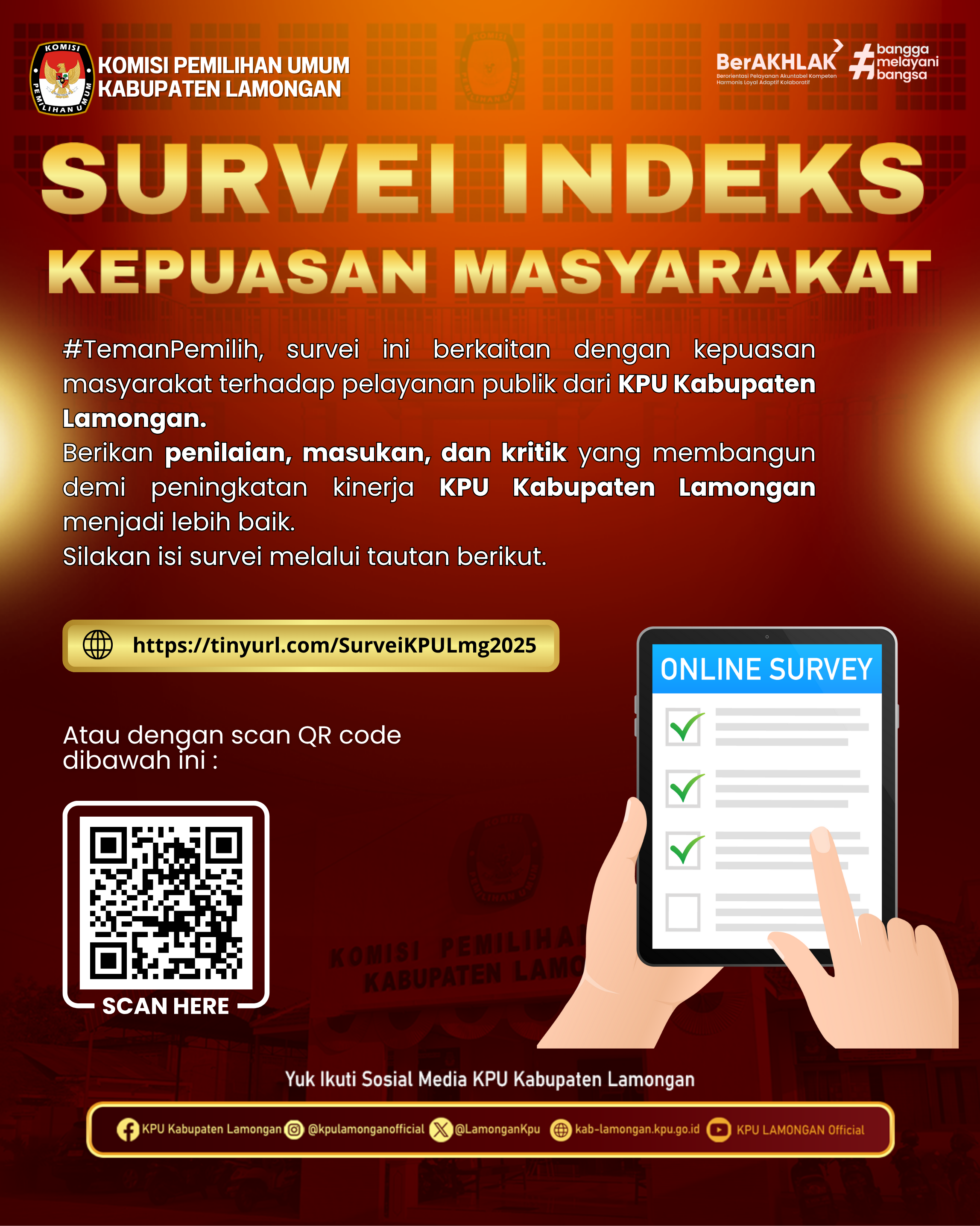 #Temanpemilih Kamu bisa membantu KPU Kabupaten Lamongan menjadi lebih baik dengan mengisi Survei Indeks Kepuasan Masayarakat melalui Link dibawah ini :